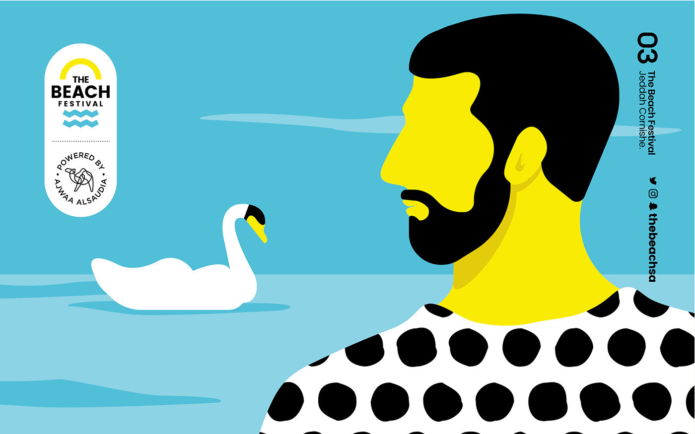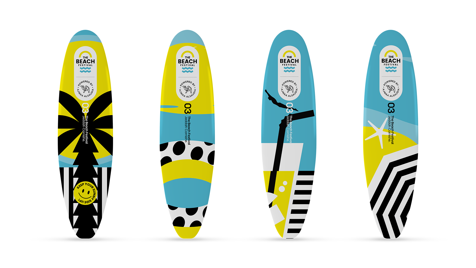 A cool, vibrant, and energetic identity with yellow, blue, white, and black colors are great way to communicate the fun and lively atmosphere of a beach festival.