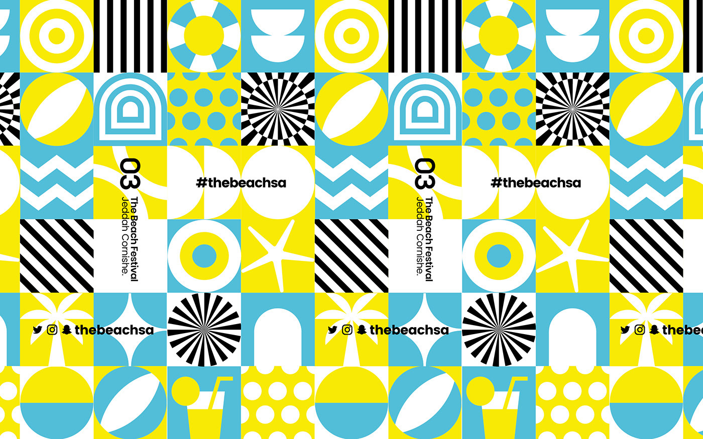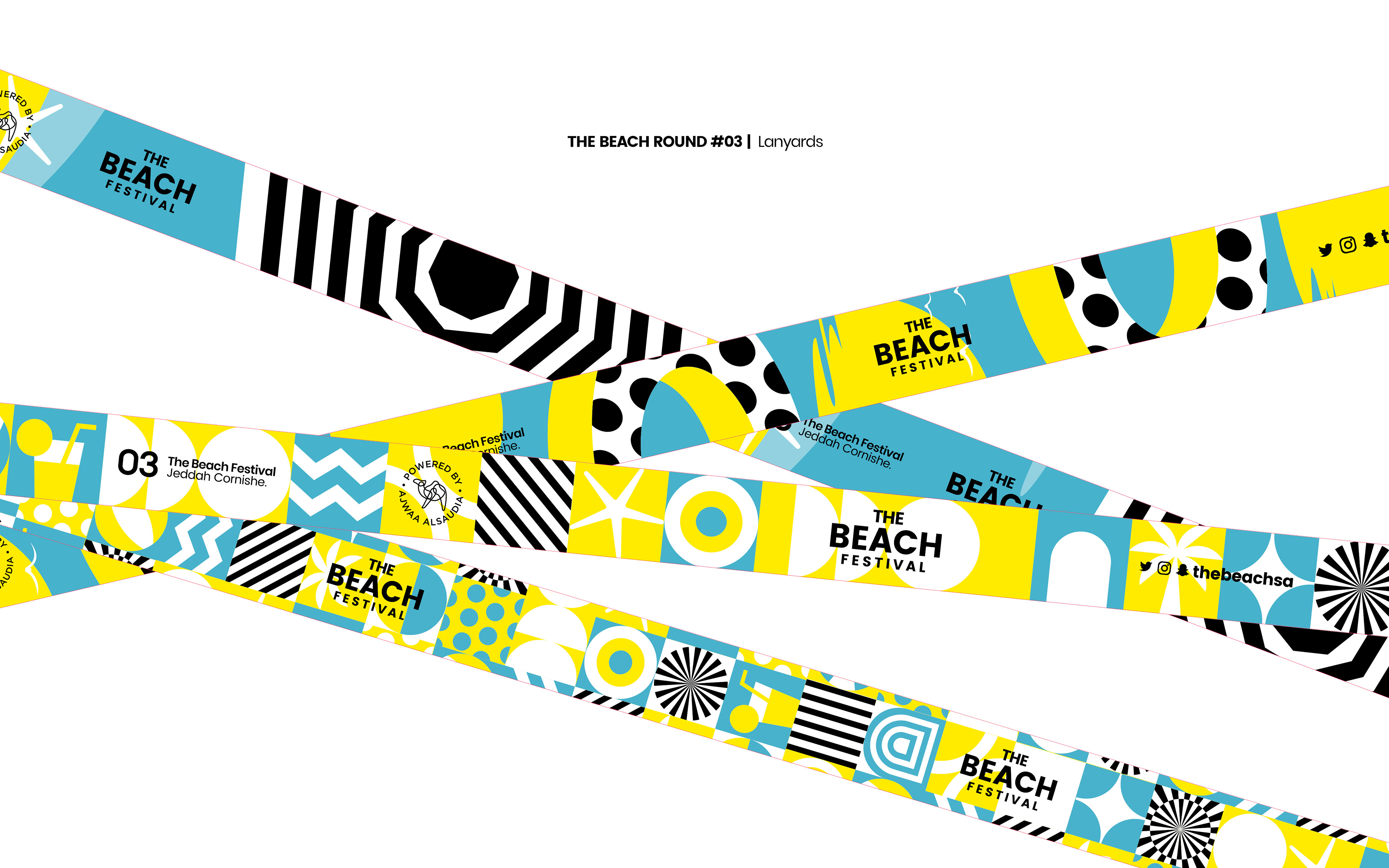 Yellow, blue, white, and black identity colors used to create a cool, vibrant, and energetic identity for a beach festival.
